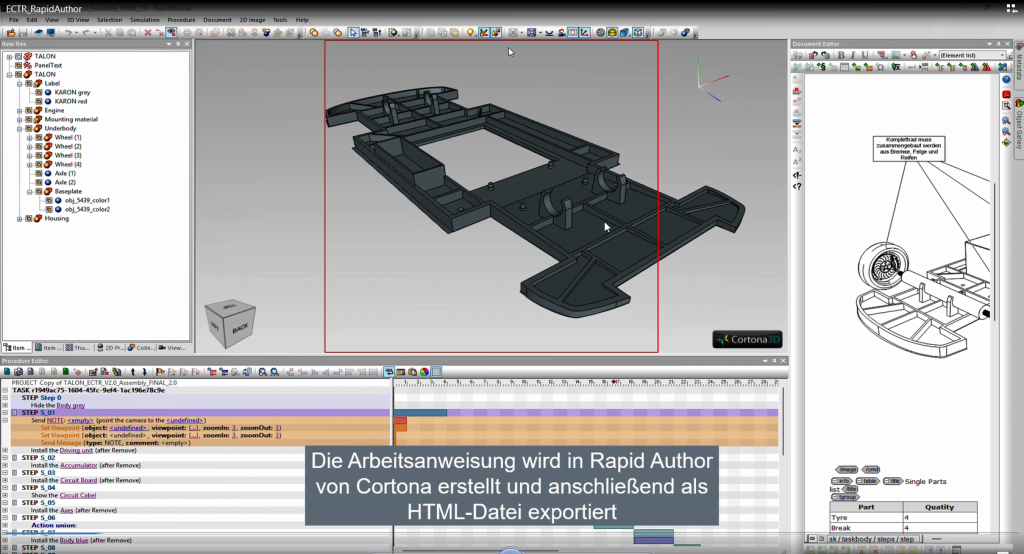 Die generierten Anleitungen lassen sich im HTML-Format (RapidManual) oder im VDS-Format (Visual Enterprise Author) exportieren – und damit entweder browserbasiert nutzen oder direkt im SAP ECTR 3D-Viewer anzeigen.